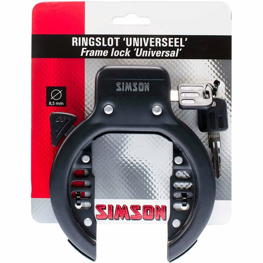 Simson Ringslot Normal er universelt anvendelig for næsten enhver ramme. Låsen leveres med to nøgler og har en bred åbning på 5,7 cm, hvilket gør låsen også velegnet til montering på brede skærme.