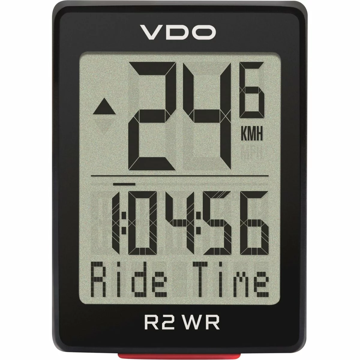 Denne kablede cykelcomputer fra VDO R-serien tilbyder dig de ti vigtigste ride-data under pendling eller under den sportslige træning på racercyklen eller Mountaibike i løbet af weekenden. R2 WR viser hastighed, rideafstand, køretid, ur, gennemsnitlig og maksimal hastighed, total afstand og køretid og den aktuelle temperatur. Desuden sammenlignes gennemsnittet med den aktuelle hastighed ved hjælp af en ‘tempop -stil’ og motiverer dig til at pedalere endnu hårdere og bryde dine egne poster. Indstilling og betjening af R2 WR er super let gennem den røde menu -knap. Det er let at indstille hjulomkretsen på grund af de forprogrammerede hjulstørrelser, hvorfra du kan vælge. Med de medfølgende kabelbånd kan den vandtætte cykelcomputer hurtigt monteres på styret og let indløses og opbevares til beskyttelse mod tyveri. Den integrerede knapcelle (CR2032) er tilstrækkelig til at levere computeren i mere end to år.